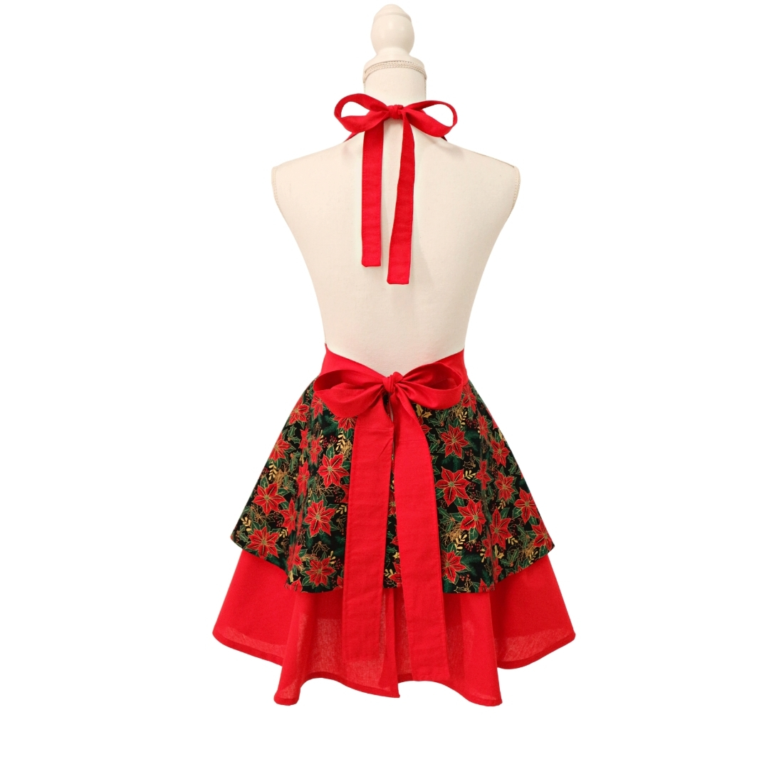 Acest deosebit șorț de bucătărie prezintă pieptar în formă de inimă. Pieptarul este creat din bumbac imprimat cu floarea Crăciunului (crăciunițe) cu inserții aurii.
