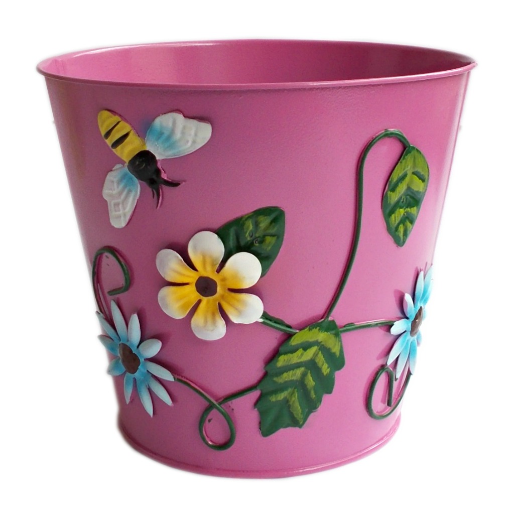 Ghiveci – decoratiune din metal de culoare roz, cu elemente decorative metalice sub forma de flori si albinuta, ideal pentru vase cu flori de dimensiuni medii