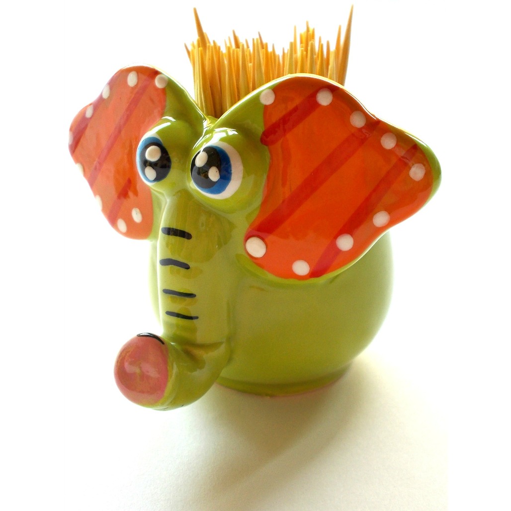 Suport decorativ pentru scobitori, in forma de elefant de culoare verde.