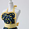 Acest deosebit șorț de bucătărie prezintă pieptar în formă de inimă, accesorizat cu volănașe galbene din bumbac create manual. Pieptarul este creat din bumbac imprimat cu lămâi și flori de lămâi.